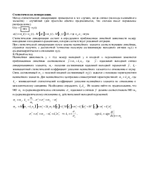 Нелинейная зависимость y = f(u) между выходной y и входной u переменными заменяется приближенным линейным соотношением: , где  - идеальный выходной сигнал линеаризованного элемента, - полезная составляющая идеальной выходной переменной , - эквивалентный статистический коэффициент усиления нелинейного элемента по отношению к шуму. Связь составляющей  с полезной входной составляющей  задается с помощью характеристики нелинейного элемента. Для нелинейности с центрально-симметричной характеристикой: , где - эквивалентный статистический коэффициент усиления нелинейного элемента по отношению к математическому ожиданию. Необходимо определить  Их можно найти из предположения, что МО  и среднеквадратическое отклонение  идеального сигнала  должны соответствовать МО my и среднеквадратическому отклонению sy действительной выходной переменной.