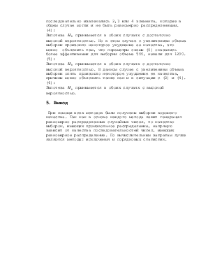 Данный метод позволил смоделировать выборки приличного качества. Это объясняется тем, что для генерации наборов случайных величин с объемами 2,3 и 4  использовался один генератор, и из выборки построенной этим генератором последовательно извлекались 2,3 или 4 элемента, которые в общем случае могли и не быть равномерно распределенными.