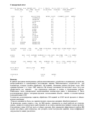 В данной программе имитировалась работа многоканального устройства и специального устройства, распределяющего и сортирующего поступающие задания. Многоканальное устройство-это три компьютера, которые должны обработать 100 заданий. Окончание работы наступает через 2045 единицы времени ( т.е через 2045 минуты.) На момент окончания (он наступает после того, как обработаются все задания) три компьютера свободны и готовы к продолжению работы. Наибольшее число одновременно задействованных компьютеров равно 3, наименьшее 0. Часть результирующего общего интервала времени использования объекта - памяти в течении периода измерения равна 0.369.