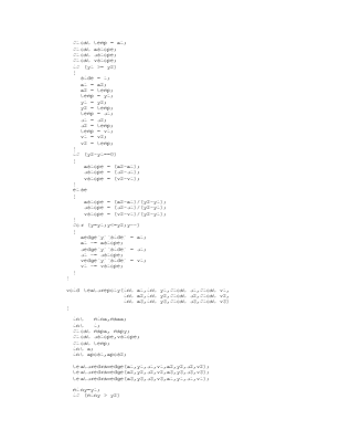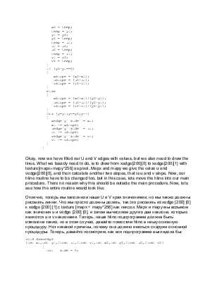 Просто, U и V - другие слова для X и Y, но так как мы уже использовали символы XY так много раз, это путало бы даже больше. Так, UV - XY координаты, но для кого? Хорошо, они - указатели в картинке, и Вы могли бы называть этот маппинг, текстуру, как большинство людей делает во всяком случае. Текстура может быть картинкой любого размера вообще, но так как мы хотели бы делать этот пример как проще, насколько возможно мы начинаем с логической ширины и высоты, а именно 256*256. Теперь, каждая вершина имеет собственную позицию на этой текстуре, и на поверхности, где мы имеем три вершины, мы также имеем три различных вида UV координат. Теперь, все, что мы фактически должны делать, должны рисовать линии из каждой вершины UV координаты к другой, подобно как мы делали с плоским заполнением, гуро оттенением или любым другим заполнением, который рисует поверхность. В этом случае Вы только должны думать о Xslope и ZSlope в Гуро как Uslope и VSlope в НТ. Но почему это? Хорошо, просто мы находим UV координаты для каждой точки на крае поверхности этим способом, который глубоко необходим если мы, чтобы иметь что - нибудь нарисованное на экране с текстурой. Теперь, мы делаем два новых наклона по имени Uslope и Vslope. Они определяются,  скажем: uslope = (u2-u1) / (x2-x1) и vslope = (v2-v1) / (x2-x1). Эти линии, которые мы включили в наш scanedge процедуру, параметры которой выглядели следующим образом: