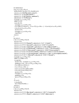 outtextxy (x+5,135,"4-Красный"); outtextxy (x+5,165,"5-Фиолетовый");