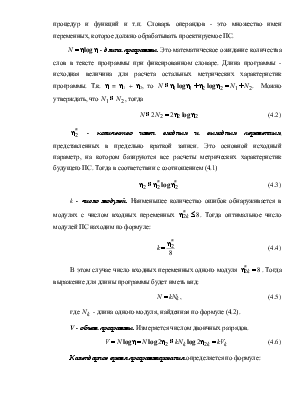 h - число слов в словаре программы. Словарь программы состоит из h1 операторов и h2 операндов. Размер словаря программы h = h1 + h2. К словарю операторов относят имена арифметических и логических операций, присваивания, условных и безусловных переходов, разделители, скобки, имена процедур и функций и т.п. Словарь операндов - это множество имен переменных, которое должно обрабатывать проектируемое ПС.