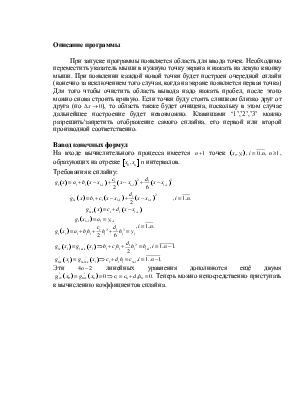 При запуске программы появляется область для ввода точек. Необходимо переместить указатель мыши в нужную точку экрана и нажать на левую кнопку мыши. При появлении каждой новой точки будет построен очередной сплайн (конечно за исключением того случая, когда на экране появляется первая точка)