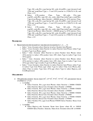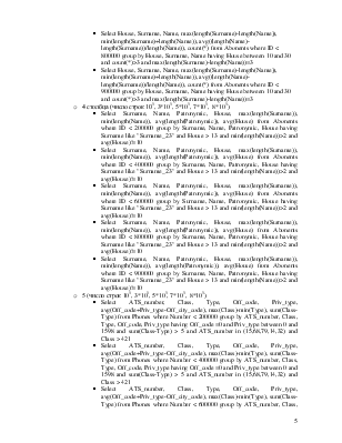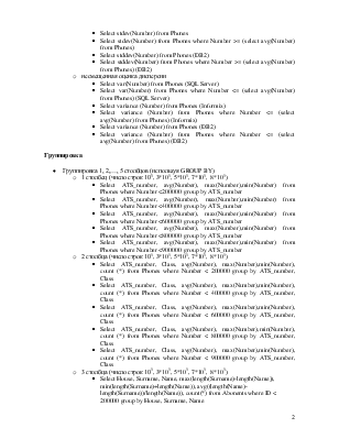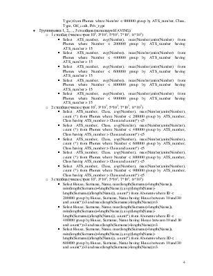 • Select ATS_number, Class, avg(Number), max(Number),min(Number), count (*) from Phones where Number < 800000 group by ATS_number, Class