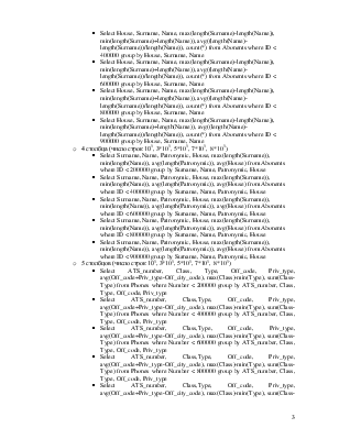 • Select House, Surname, Name, max(length(Surname)-length(Name)), min(length(Surname)+length(Name)), avg((length(Name)-length(Surname))/length(Name)), count(*) from Abonents where ID < 800000 group by House, Surname, Name