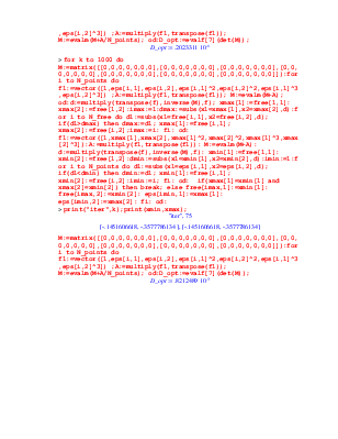 > for k to 1000 do M:=matrix([[0,0,0,0,0,0,0],[0,0,0,0,0,0,0],[0,0,0,0,0,0,0],[0,0,0,0,0,0,0],[0,0,0,0,0,0,0],[0,0,0,0,0,0,0],[0,0,0,0,0,0,0]]):for i to N_points do f1:=vector([1,eps[i,1],eps[i,2],eps[i,1]^2,eps[i,2]^2,eps[i,1]^3,eps[i,2]^3]) ;A:=multiply(f1,transpose(f1)); M:=evalm(M+A); od:d:=multiply(transpose(f),inverse(M),f); xmax[1]:=free[1,1]: xmax[2]:=free[1,2]:imax:=1:dmax:=subs(x1=xmax[1],x2=xmax[2],d):for i to N_free do d1:=subs(x1=free[i,1],x2=free[i,2],d); if(d1>dmax) then dmax:=d1; xmax[1]:=free[i,1]; xmax[2]:=free[i,2];imax:=i: fi: od: f1:=vector([1,xmax[1],xmax[2],xmax[1]^2,xmax[2]^2,xmax[1]^3,xmax[2]^3]):A:=multiply(f1,transpose(f1)): M:=evalm(M+A): d:=multiply(transpose(f),inverse(M),f): xmin[1]:=free[1,1]: xmin[2]:=free[1,2]:dmin:=subs(x1=xmin[1],x2=xmin[2],d):imin:=1:for i to N_points do d1:=subs(x1=eps[i,1],x2=eps[i,2],d); if(d1<dmin) then dmin:=d1; xmin[1]:=free[i,1]; xmin[2]:=free[i,2]:imin:=i; fi: od: if(xmax[1]=xmin[1] and xmax[2]=xmin[2]) then break; else free[imax,1]:=xmin[1]: free[imax,2]:=xmin[2]: eps[imin,1]:=xmax[1]: eps[imin,2]:=xmax[2]: fi: od: