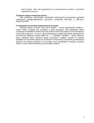 Каждый процесс получает свою часть данных – строки расширенной матрицы – путем чтения из файла или генерации в самой программе. Для упрощения задачи рекомендуется выбирать количество строк, кратное количеству процессов. Рекомендуемое количество процессов – от 4 до 8. Для тестирования и отладки программы рекомендуется использовать функции вывода printf(“%d: …”, iMyRank), iMyRank – номер процесса. Более удобным может оказаться вывод результатов в файлы, каждый из которых формируется отдельным процессом. В качестве контрольных результатов рекомендуется вывести для каждого процесса его исходную часть расширенной матрицы, результат прямого хода и окончательный результат решения задачи.