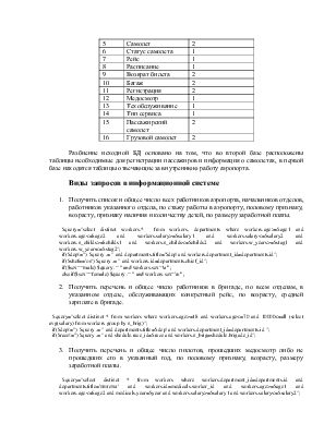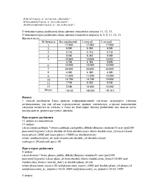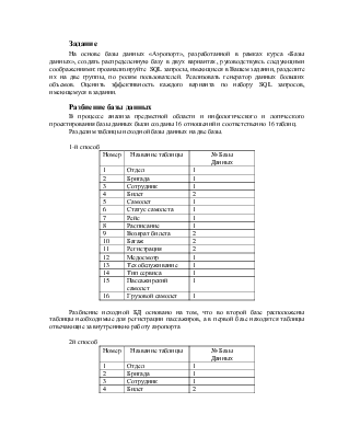 1 способ разбиения базы данных информационной системы «аэропорт» считаем оптимальным, так как объем перенесенных данных значителен, а время выполнения запросов меняется не сильно, к тому же благодаря такому разбиению мы можем легче распределить уровни доступа к данным.