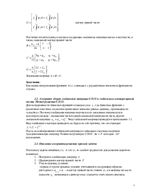 Для непрерывности базисных функций в каждом узле , где базисные функции с различных конечных элементов принимают значение равное единице, производим их «склейку». Поэтому глобальная матрица получается из локальных матриц путем некоторого вклада – наложения частей одной локальной матрицы на часть другой локальной матрицы: . Вид глобальной матрицы приведён в приложении 1.1. Вид глобального вектора приводить не будем по той причине, что он очевиден: .