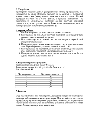 Трехмерные массивы данных распределяются между процессорами, т.е. разрезаются на блоки. Разбиение проходит по координате x. Двумерный массив данных для фиксированного значения x назовем слоем. Каждый процессор получает свою часть данных, в процессе вычислений  по необходимости обменивается крайними слоями, получает очередной результат и проверяет условие выхода. Вычисления заканчиваются, если на всех процессорах выполняется условие выхода.