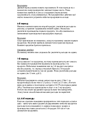 Немного понизили цены на второй продукт, увеличили расходы на рекламу, сохранили традиционно низкий сервис. Несколько увеличили производство первого продукта, что обуславливалось заниженным производством предыдущего периода.