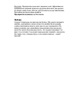 Сыграв 10 периодов, мы многому научились. Мы сумели исправить ошибки, допущенные в начале игры (эти ошибки были вызваны слабым пониманием игры) и взять курс на рост предприятия. По нашему мнению, при дальнейшем продолжении игры мы вполне могли бы занять более высокое место. Это хорошо показывает тот факт, что в течение 3 последних периодов наш текущий z-показатель был выше, чем у лидеров игры, а в последнем периоде – самый высокий.