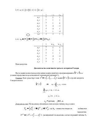 Алгоритм определения оптимального плана можно выразить следующим образом. Начинают с походной недопустимой таблицы T0.Затем построив правильное целочисленное отсечение, удовлетворяющее условиям 1-4, переходят к таблице T1, затем к T2, и т.д. пока не получат допустимую таблицу. Как и прежде используются итерации L-метода, ограничения, полученные из сформулированного отсечения приписываются снизу к соответствующей таблице. Вся последовательность таблиц, формируемая в процессе решения, является целочисленной и L-нормальной.
