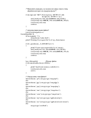 Сервер находится в режиме ожидания соединения от клиента. После установления соединения сервер принимает строки от клиента, распознавая значащие: запрос на передачу клиенту какого-либо файла (команда GET). Если запрашиваемый файл существует, то сервер посылает клиенту заголовок HTTP 1.0 (в котором сообщает тип передаваемого файла и его размер), считывает сам файл и передает его содержимое клиенту. Если файла не существует или нет значащих строк, то клиенту передается сообщение об ошибке.