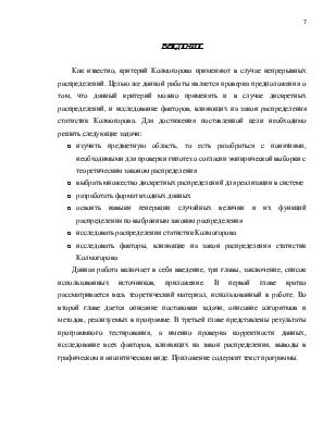 Как известно, критерий Колмогорова применяют в случае непрерывных распределений. Целью же данной работы является проверка предположения о том, что данный критерий можно применять и в случае дискретных распределений, и исследование факторов, влияющих на закон распределения статистик Колмогорова. Для достижения поставленной цели необходимо решить следующие задачи: