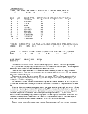 Абсолютное системное время в начале работы программы равно 0. Конечное время равно 172800 (количество секунд, содержащихся в шести восьмичасовых рабочих днях ). Таким образом программа сымитировала необходимое время работы магазина.