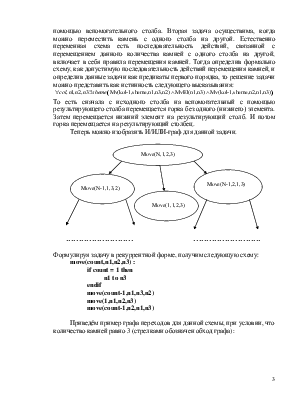 Идея решения данной задачи состоит в сведении общей задачи к задачам меньшей размерности, то есть при перемещении  камней задача сводится к перемещению верхних  камней, затем перемещением на нужное место нижнего камня и только потом перемещение  камней на больший камень. Фактически данное решение можно представить в виде И/ИЛИ-графа. Который схематически представляется в виде:
