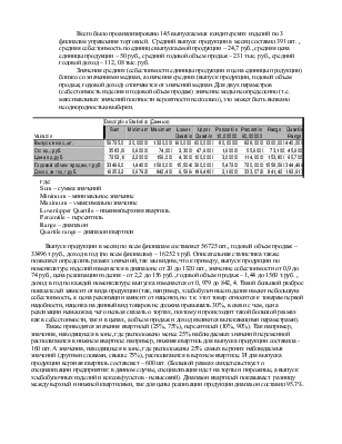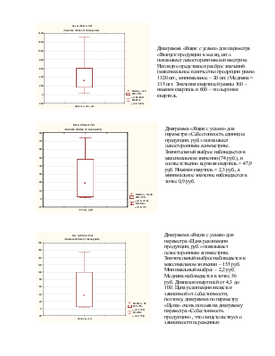 Также приводятся значения квартилей (25%, 75%), персентилей (10%, 90%). Так например, значения, находящиеся в зоне, где расположено менее 25% наблюдаемых значений переменной располагаются в нижнем квартиле: например, нижняя квартиль для выпуска продукции составила -  160 шт. А значения, находящиеся в зоне, где расположены 25% самых верхних наблюдаемых значений (другими словами, свыше 75%), располагаются в верхнем квартиле. И для выпуска продукции верхняя квартиль составляет – 600 шт. (Большой размах свидетельствует о специализации предприятия: в данном случае, специализация идет на торты и пирожные, а выпуск хлебобулочных изделий и кексов/рулетов - невысокий). Диапазон квартилей показывает  разницу между верхней и нижней квартилями, так для цены реализации продукции диапазон составил 95,7%.