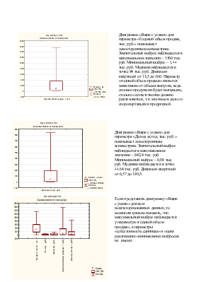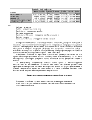 Выпуск продукции в месяц по всем филиалам составляет 56725 шт., годовой объем продаж – 33496 т.руб., доход в год (по всем филиалам) – 16252 т.руб. Описательная статистика также позволяет определить размах значений, так мы видим, что к примеру, выпуск продукции по номенклатуре изделий изменяется в диапазоне от 20 до 1320 шт., значение себестоимости от 0,9 до 74 руб., цена реализации изделия – от 2,2 до 156 руб., годовой объем продаж – 1,44 до 1560 т.руб. , доход в год по каждой номенклатуре выпуска изменяется от 0, 979 до 842, 4. Такой большой разброс показателей зависит от вида продукции (так, например, хлебобулочные изделия имеют небольшую себестоимость, а  цена реализации зависит от наценки, но т.к. этот товар относится к товарам первой надобности, наценка на данный вид товаров не должна превышать 30%, в связи с чем, цена реализации невысокая, чего нельзя сказать о тортах, поэтому и происходит такой большой размах как в себестоимости, так и в ценах, а объем продаж и доход являются вытекающими параметрами).