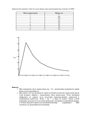 2.  Для одной и той же размерности задачи на разном количестве процессоров время счета начинает убывать с возрастанием числа процессоров. Точку минимума обнаружить не удалось из-за отсутствия производственных мощностей в необходимом количестве. Точку 1 (np = 1) вряд ли можно считать точкой минимума, поскольку в этом случае происходит сортировка в оперативной памяти, и поэтому загрузить процессор сортировкой      массива, содержащего 4000 элементов, не представляется возможным.