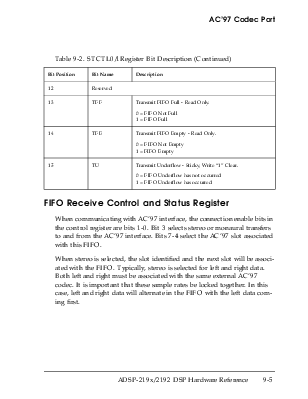 AC’97 is a digital interface for the transport of audio and modem samples that was originally developed by Analog Devices, Creative Labs, Intel, National Semiconductor, and Yamaha and documented in the AC’97 specification. For ADSP-2192, the AC’97 specification provides a high audio architecture for the 1997 and 1998 volume platform segments.