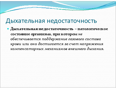 Дыхательная недостаточность – патологическое состояние организма, при котором не обеспечивается поддержание газового состава крови или оно достигается за счет напряжения компенсаторных механизмов внешнего дыхания.